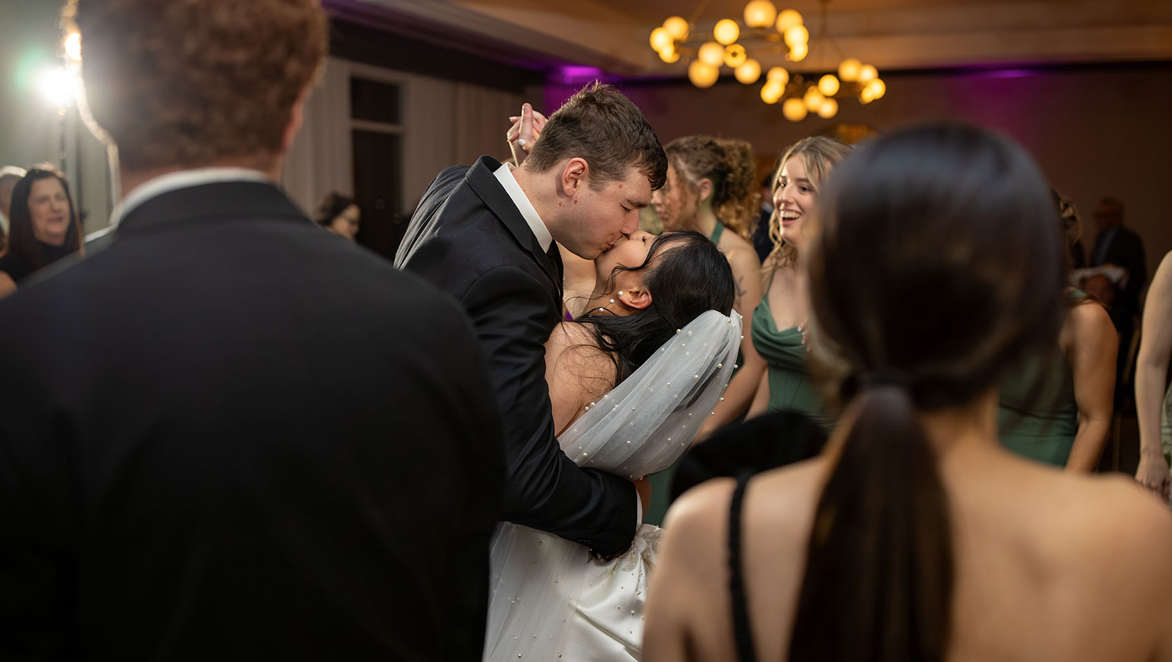 The evening was filled with delicious cuisine, vibrant music, and joyful laughter, with guests mingling across ballroom and pre-function spaces. Every detail, from custom napkins featuring drawings of the couple’s cat to carefully curated seating areas, reflected their love story and personal touches.